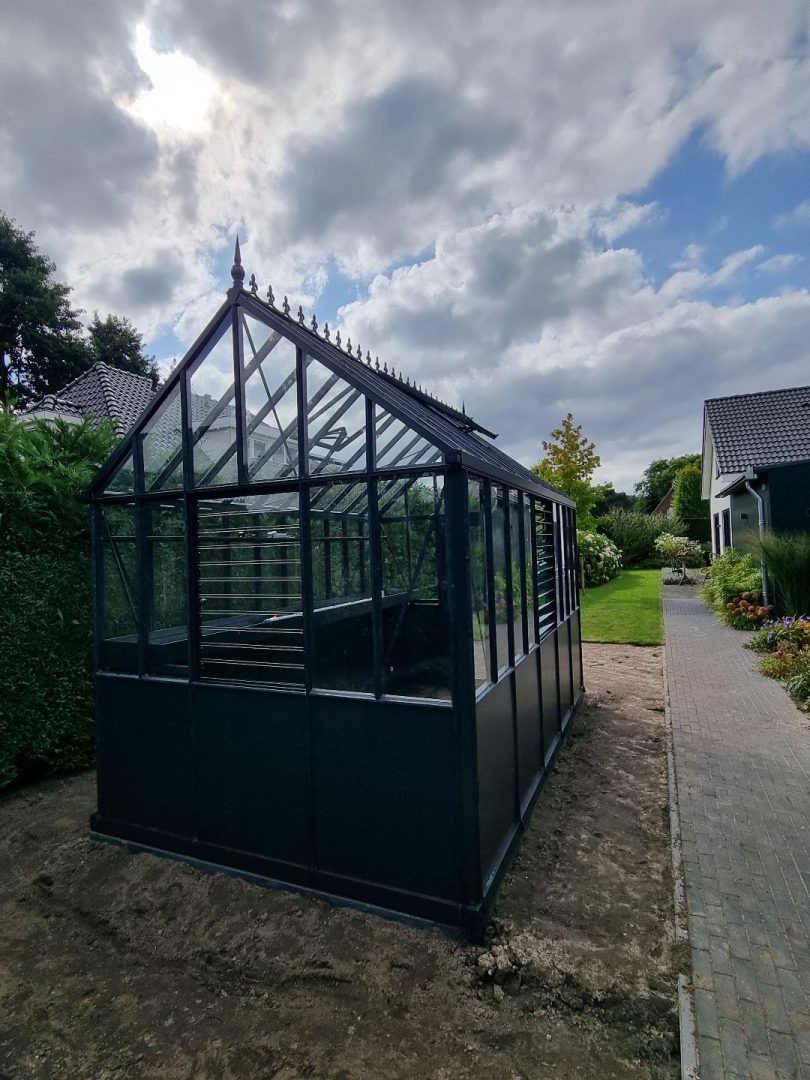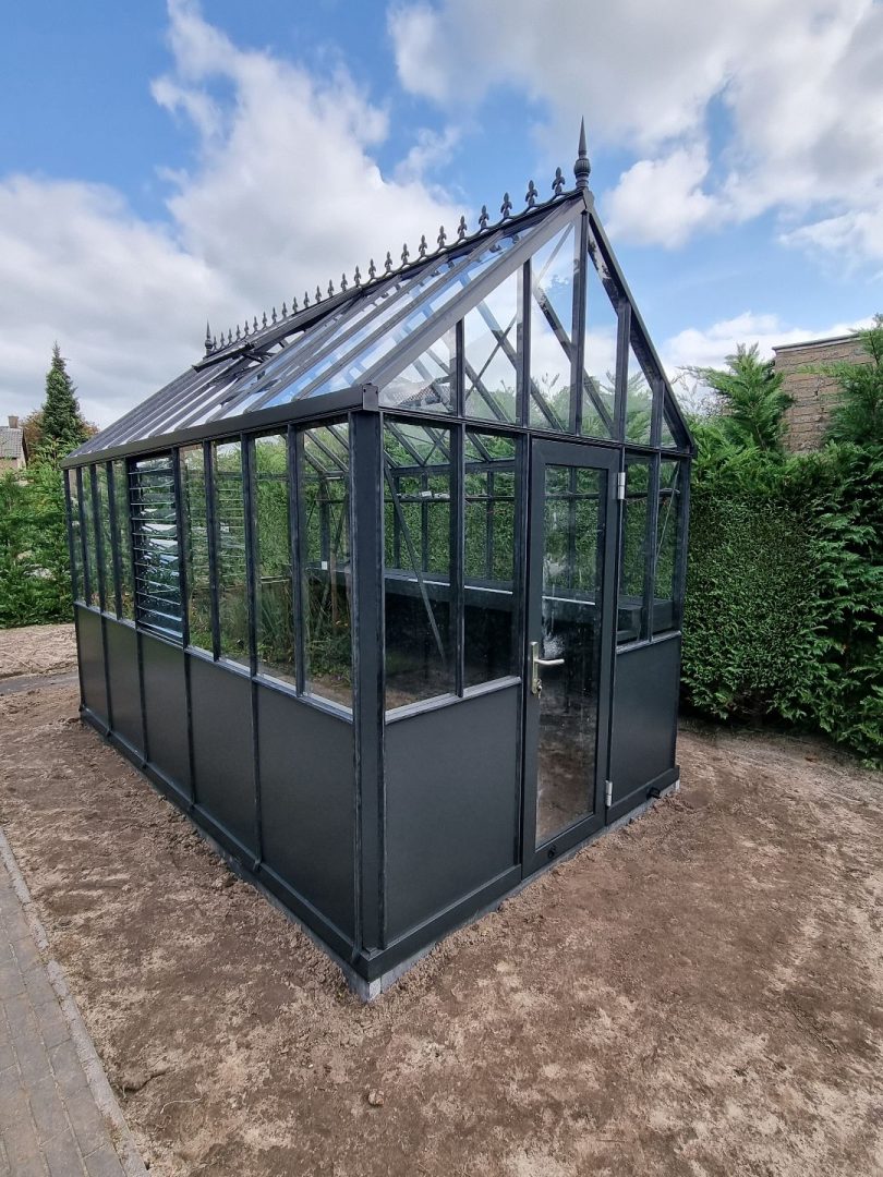 * RAL-kleur; de standaard kleuren van de kas zijn, RAL9005 zwart, RAL6009 dennengroen of RAL9010 roomwit. De klant heeft deze kas gecoat in RAL7043 – verkeersgrijs.